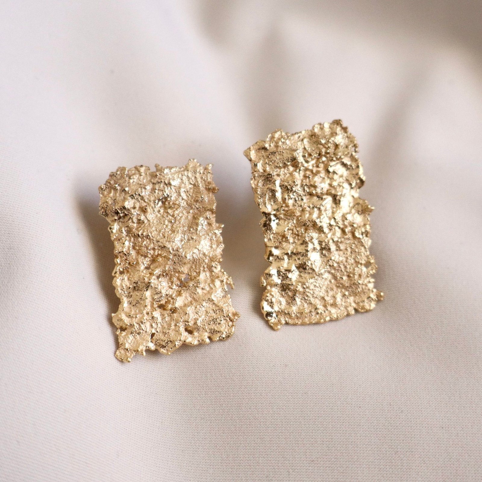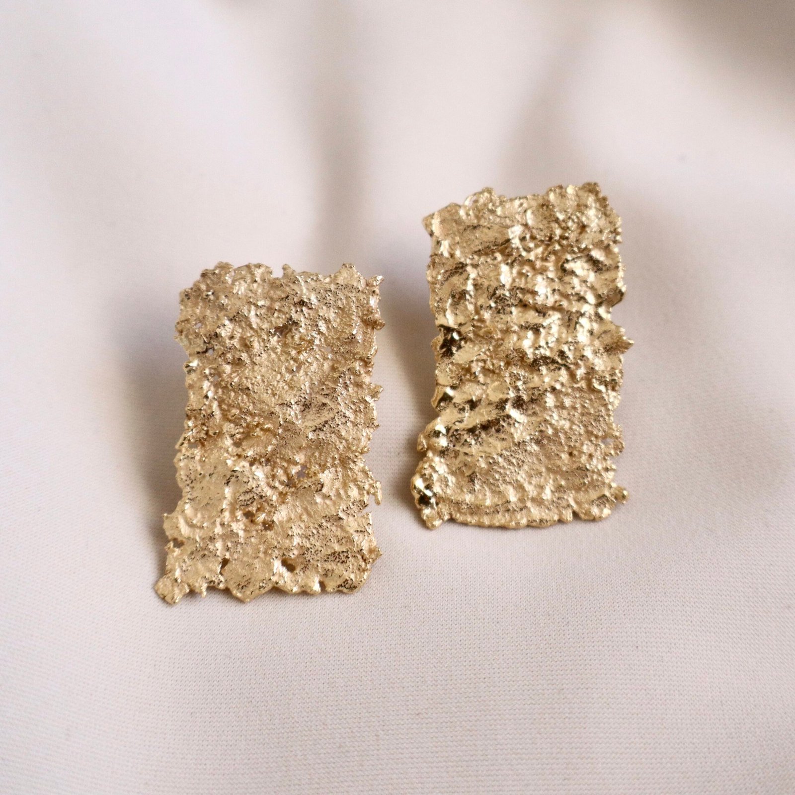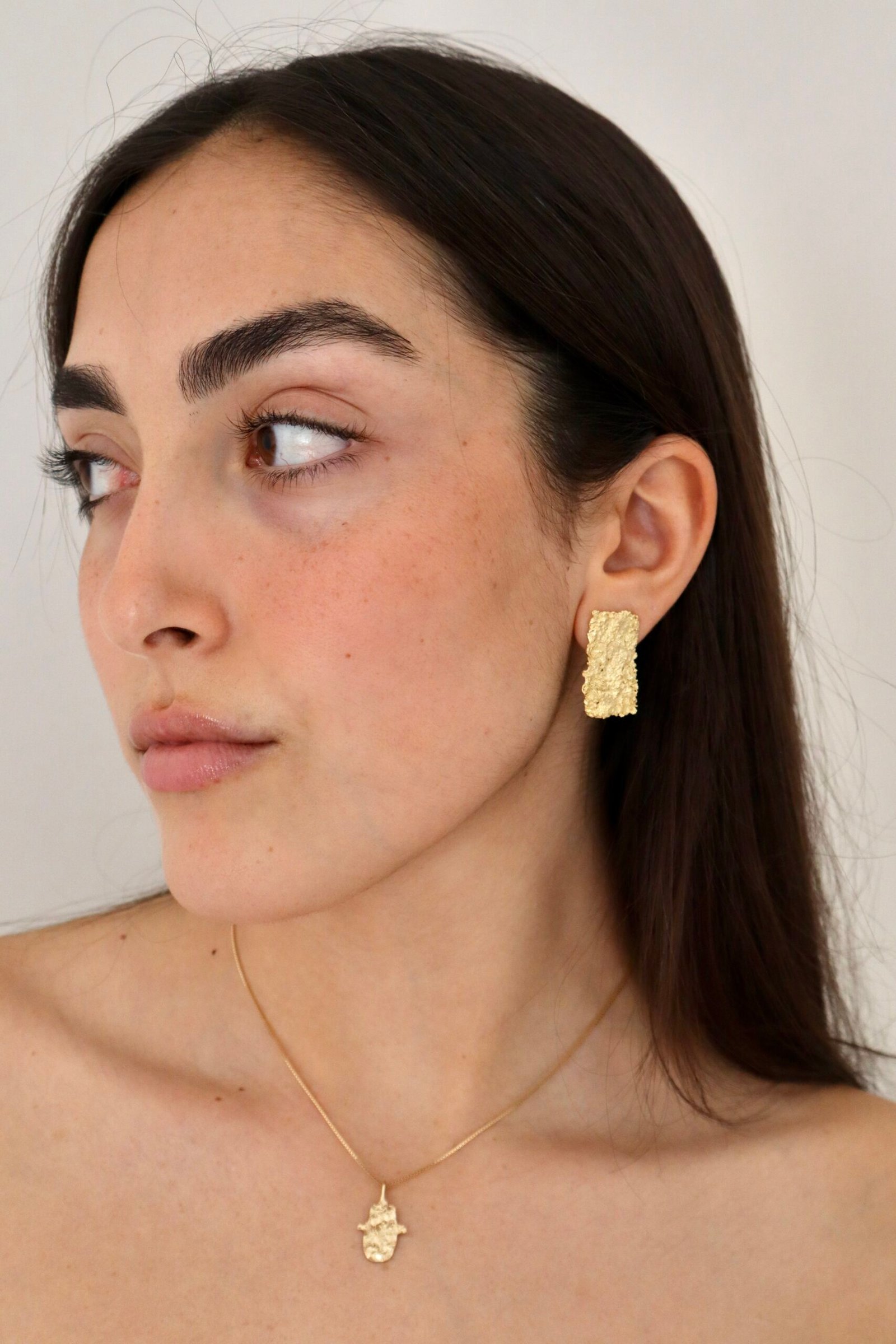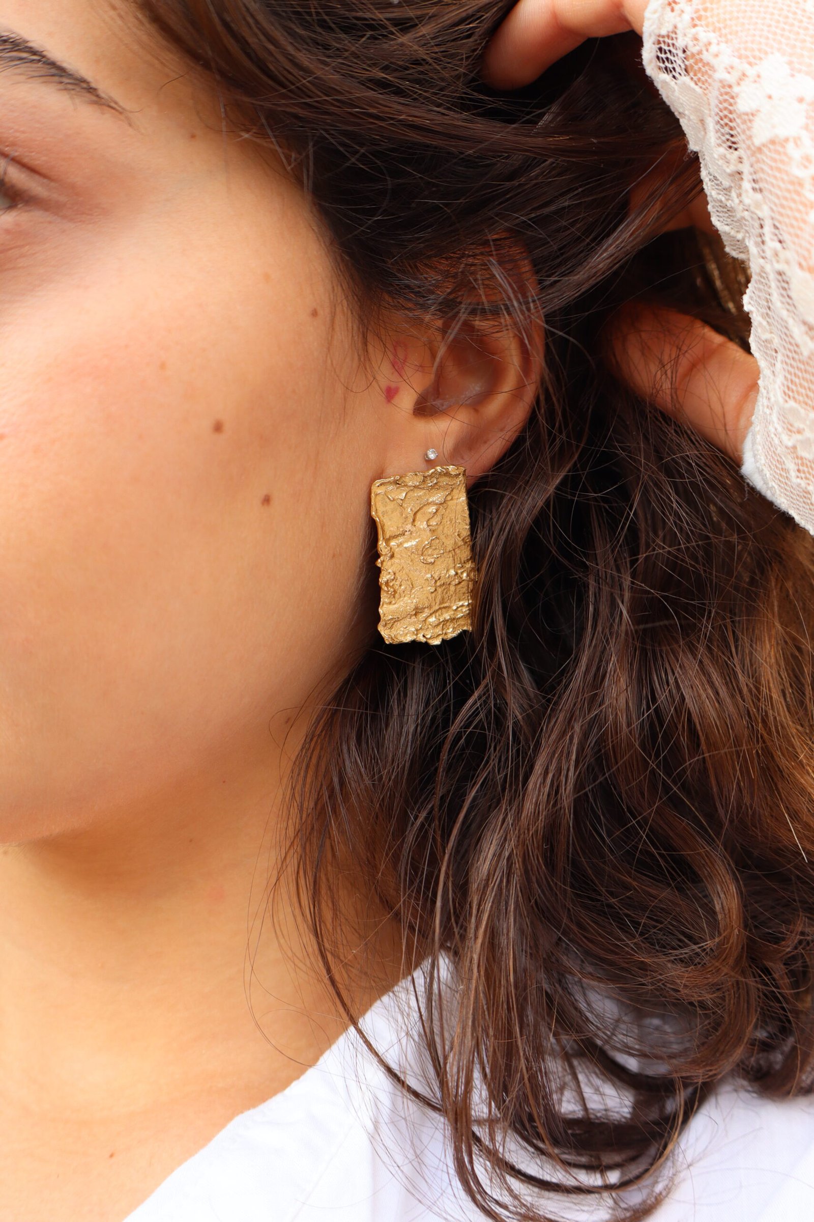 עגילים מלבניים בטקסטורת אבן ירושלמית, כסף 925 / ציפויי 5 מקרונים של זהב 18 קראט הכי גדולים בקולקציה. אורך 4 ס״מ רוחב 3 ס״מ
