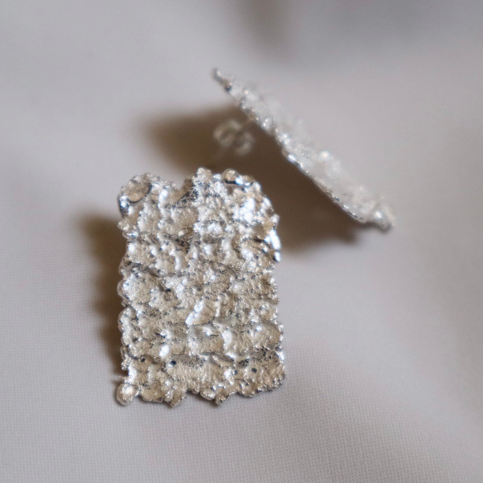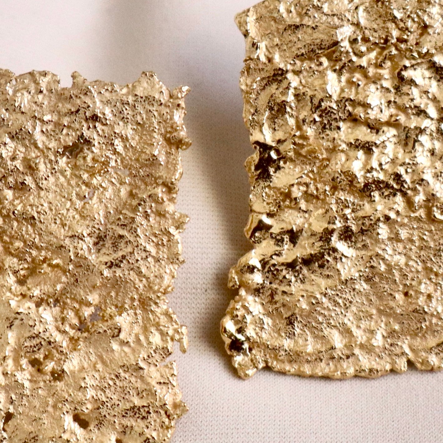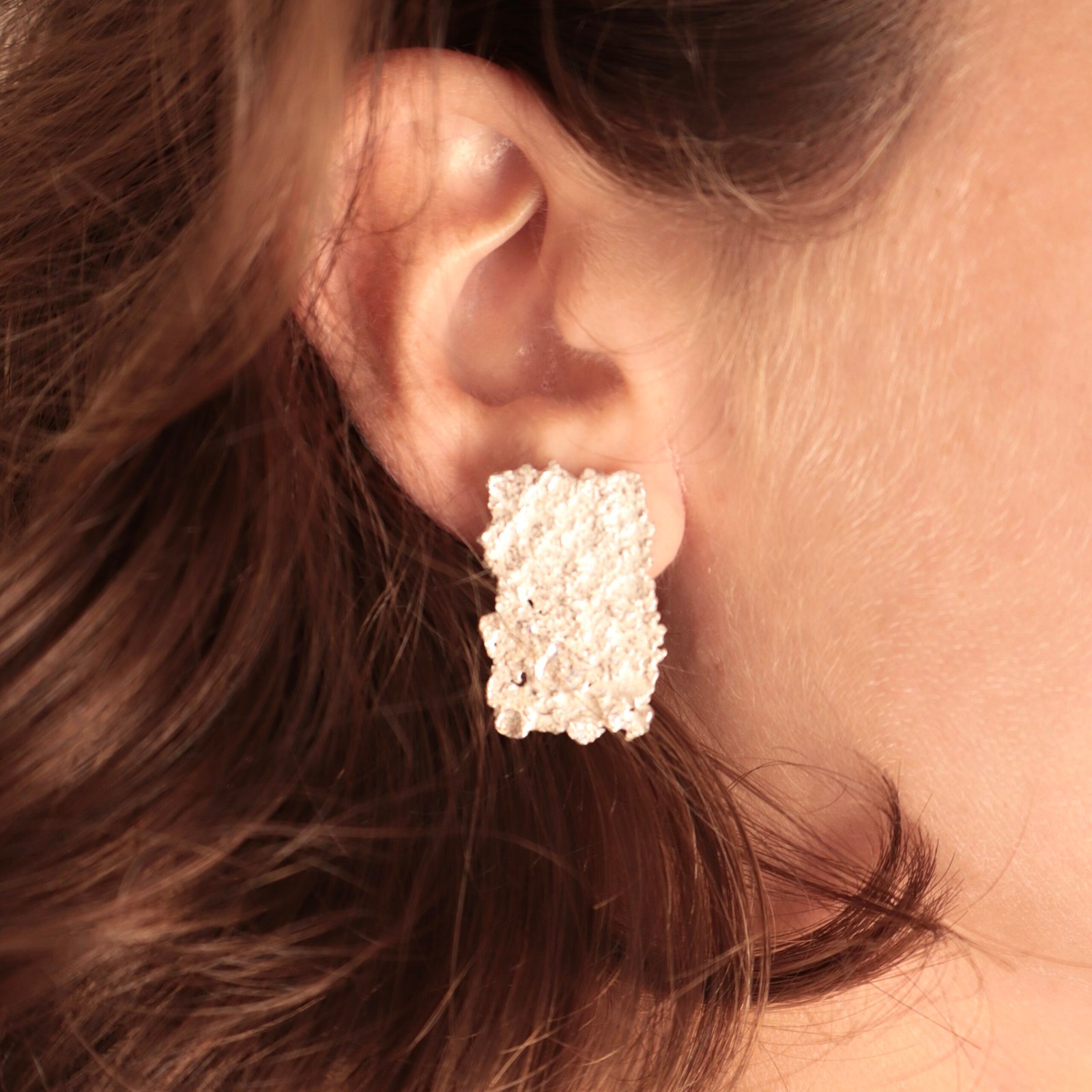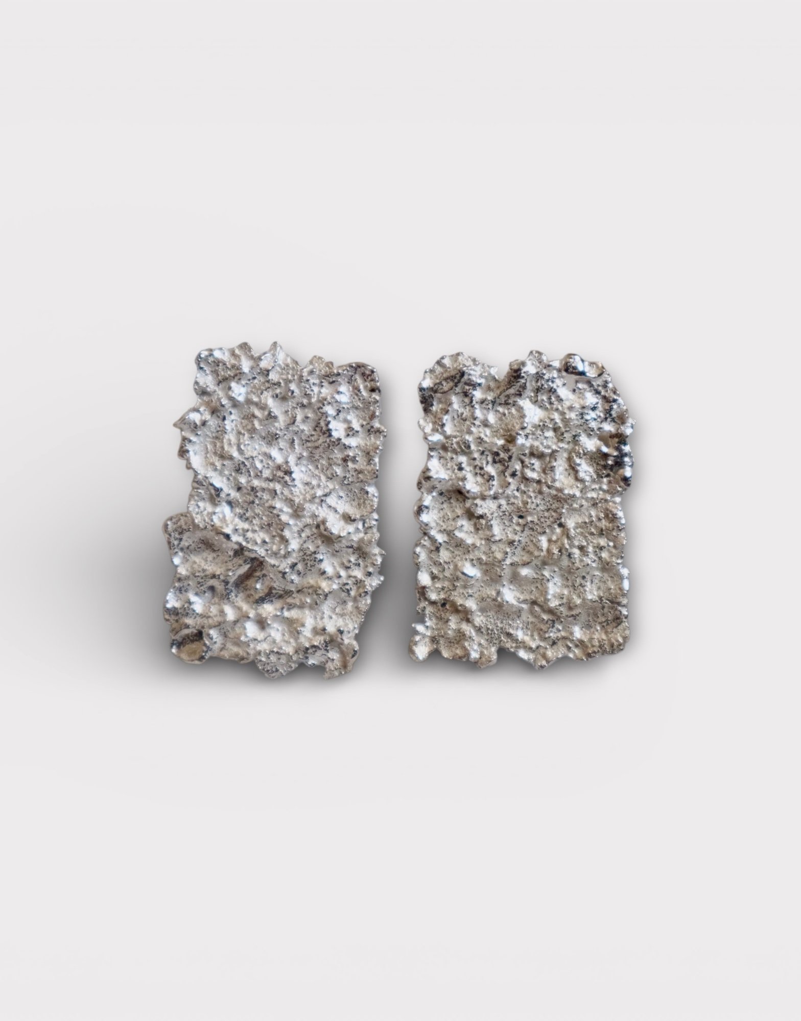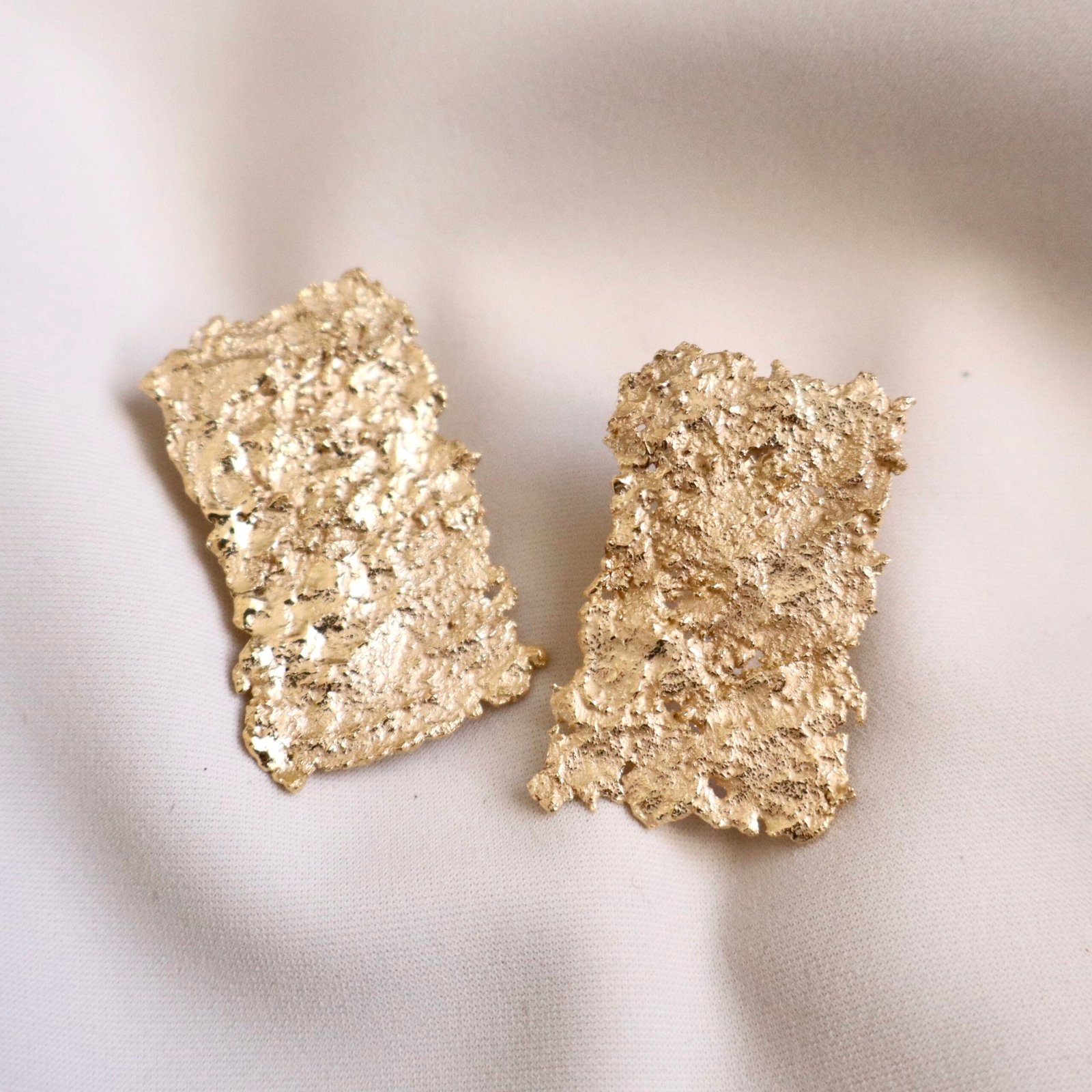 עגילים מלבניים בטקסטורת אבן ירושלמית, כסף 925 / ציפויי 5 מקרונים של זהב 18 קראט הכי גדולים בקולקציה. אורך 4 ס״מ רוחב 3 ס״מ