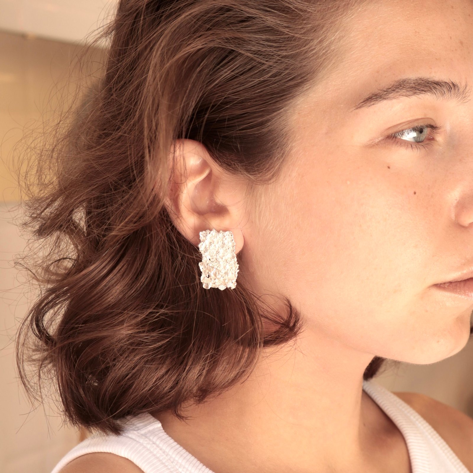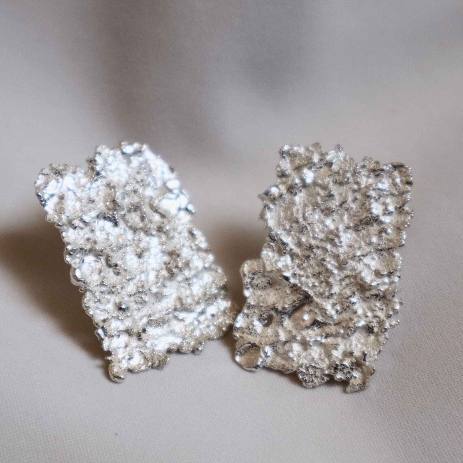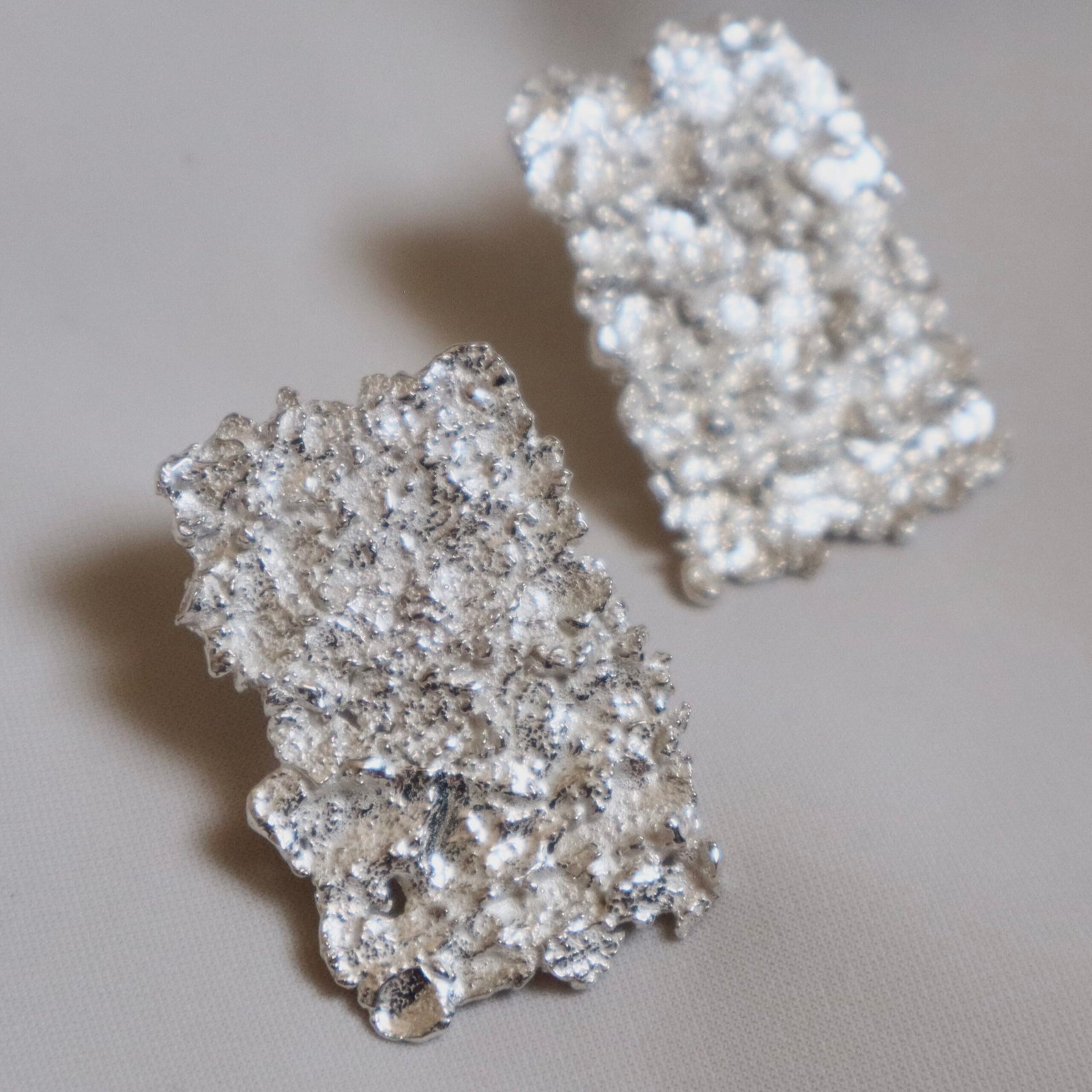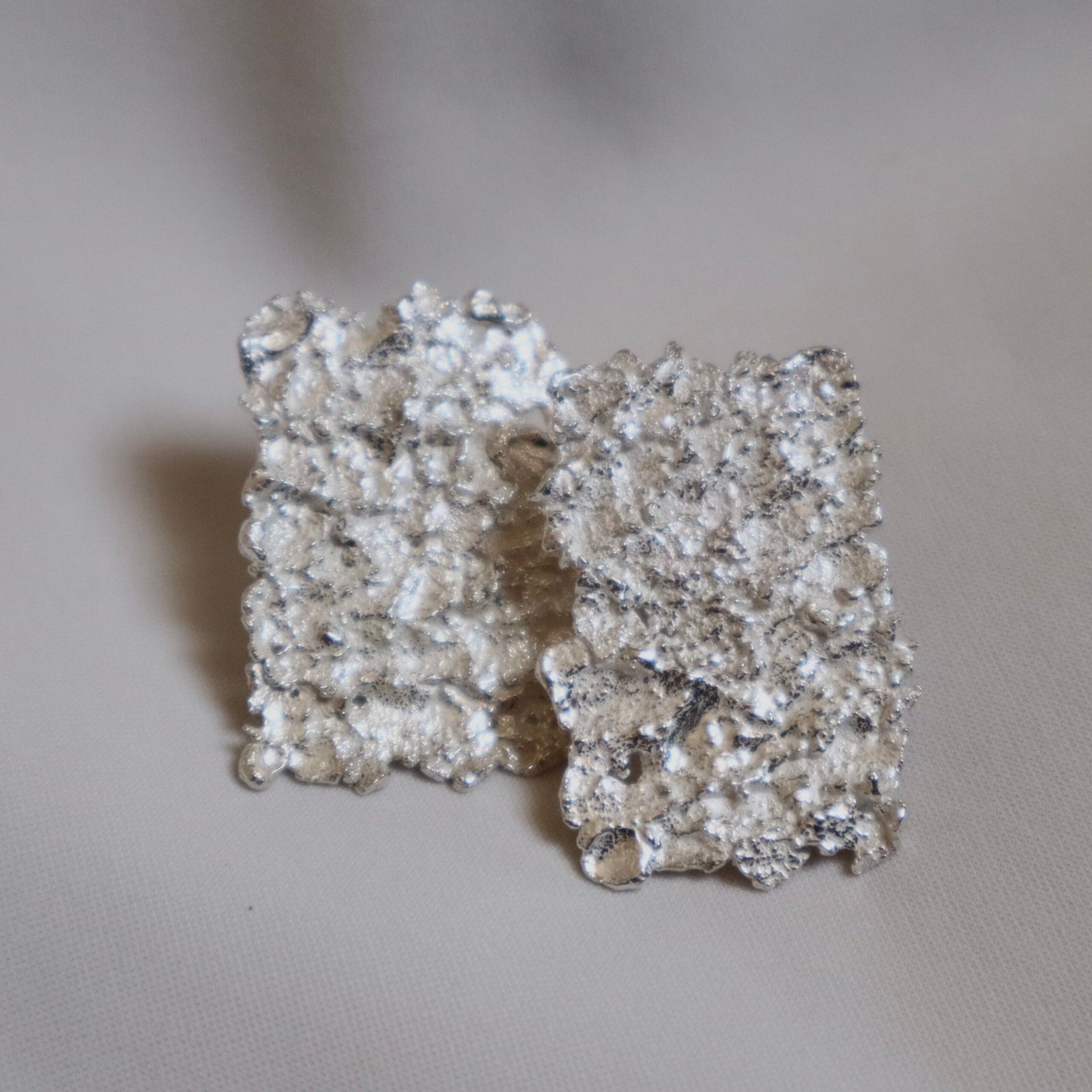 עגילים מלבניים בטקסטורת אבן ירושלמית, כסף 925 / ציפויי 5 מקרונים של זהב 18 קראט הכי גדולים בקולקציה. אורך 4 ס״מ רוחב 3 ס״מ