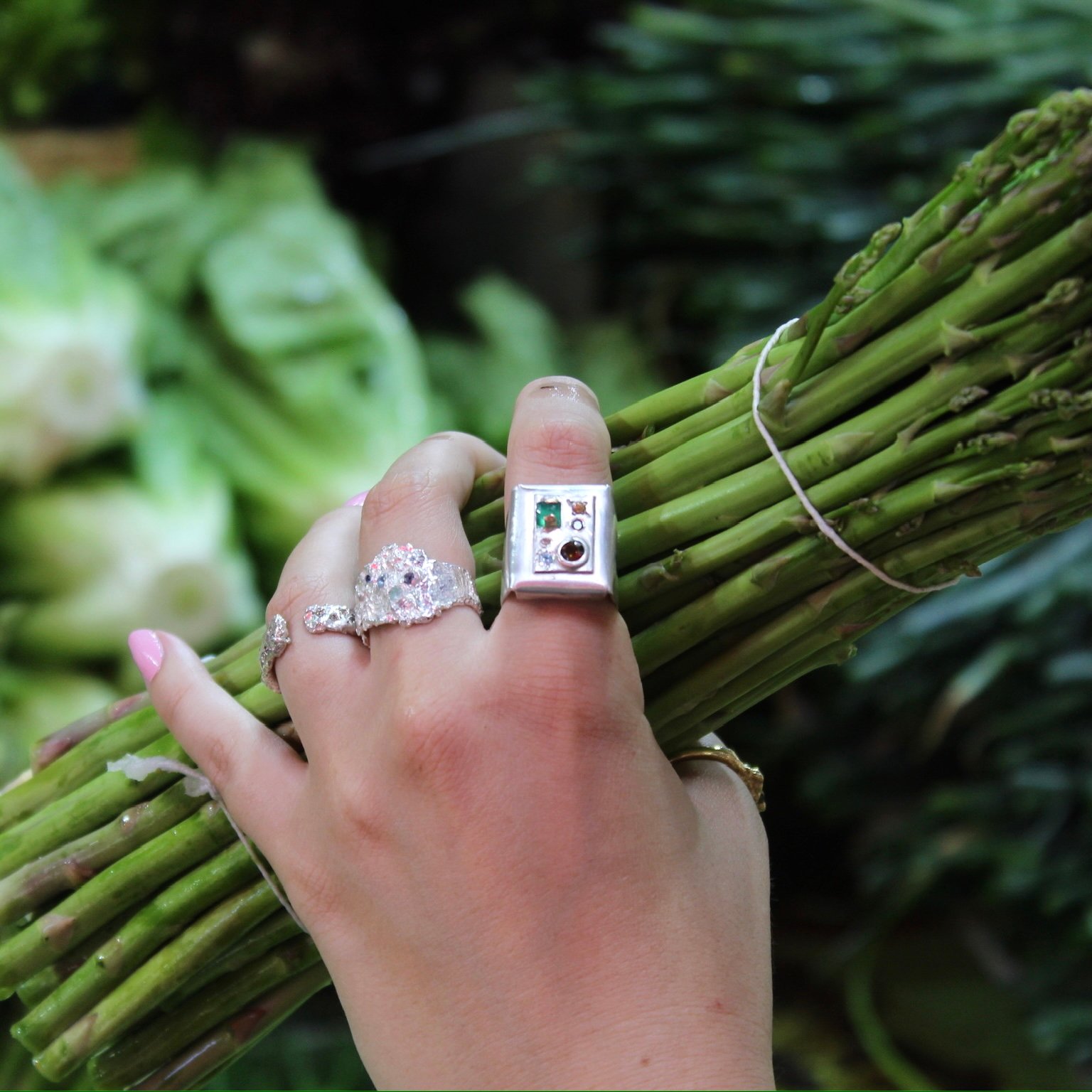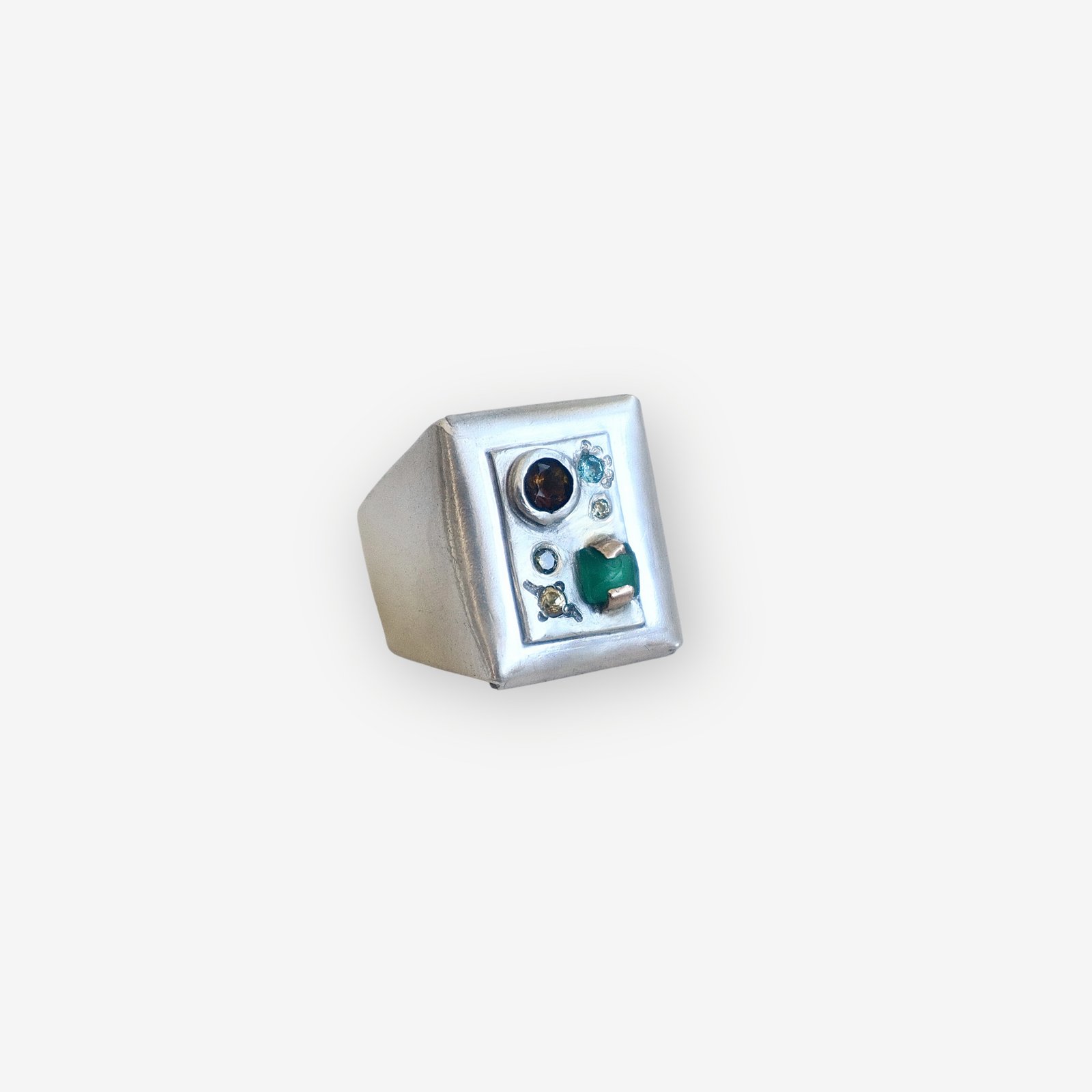 טבעת קופסא מלבנית, כסף 925, משובצת באבני חן צבעוניות ושונות. טורמלין בצבע ירוק זית 5 מ״מ אבן אמרלד ירוקה מרובעת 5 מ״מ ספיר צהוב 2 מ״מ אקווה מרין תכלת 2 מ״מ טורמלין ירוק זית 2 מ״מ טורמלין ירוק בהיר 1.5 מ״מ